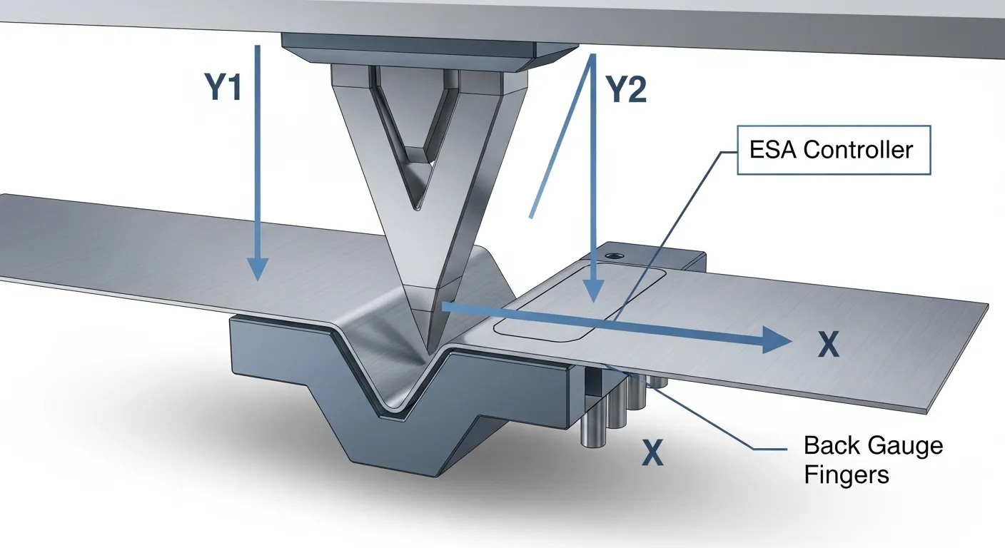 コントローラーは基本的な3軸構成から複雑な8軸構成まで幅広く対応可能です. 理解 8-軸式CNCプレスブレーキの意味 ここで重要な点です, ESAユニットはRAMの同期運動を調整しなければなりません (Y1, Y2) バックゲージの独立運動とともに (X, R, Z1, Z2) さらには前方の支柱まで.